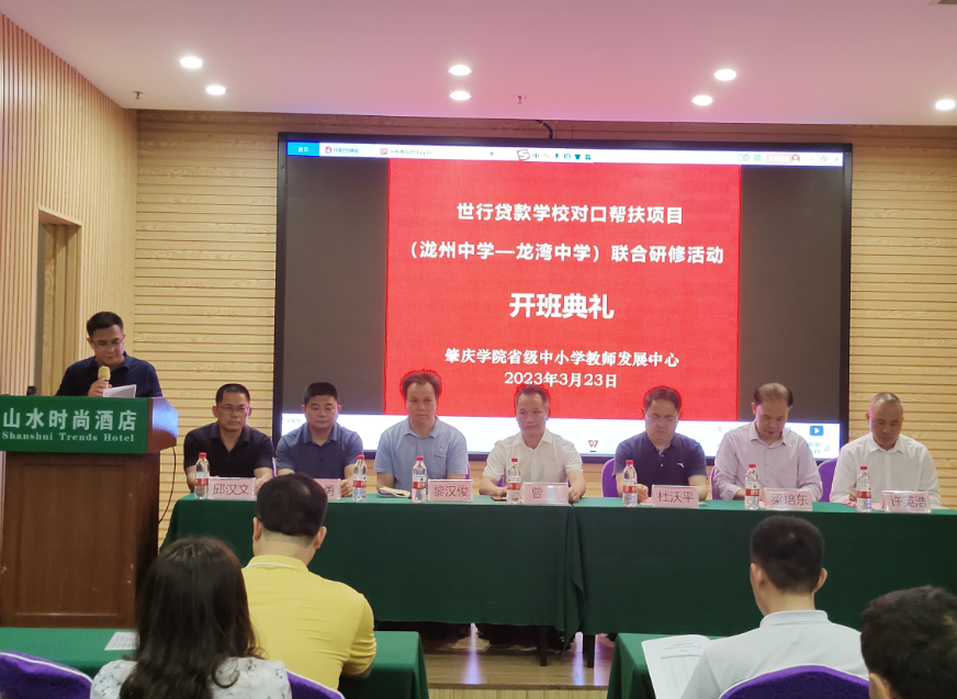 3月23日下午,省教育厅世行贷款学校对口帮扶项目(泷州中学-龙湾中学) 联合研修班在肇庆山水酒店7楼会议室如期举行开班典礼。肇庆学院williamhill威廉希尔官网副院长曾毅教授、罗定市教师发展中心教研部黎汉俊主任、泷州中学及龙湾中学校领导与老师出席了开班仪式。