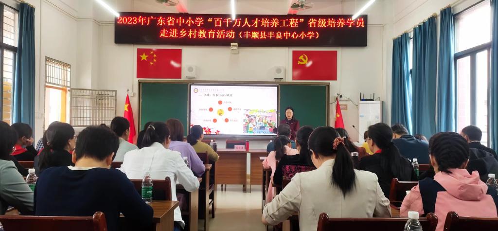 4月24日上午,肖晓玛一行到丰顺县参加中小学“百千万人才培养工程”省级培养学员走进乡村教育活动的启动仪式。34名省级名教师、名班主任、名校长分赴丰顺县七所中小学进行为期两天的送教活动,采用线上线下两种方式授课,辐射教师约2800人。