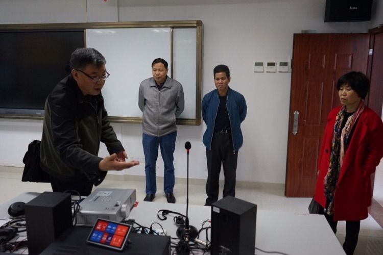 张晓峰副院长向客人们介绍教学新媒体实训室设备功能
