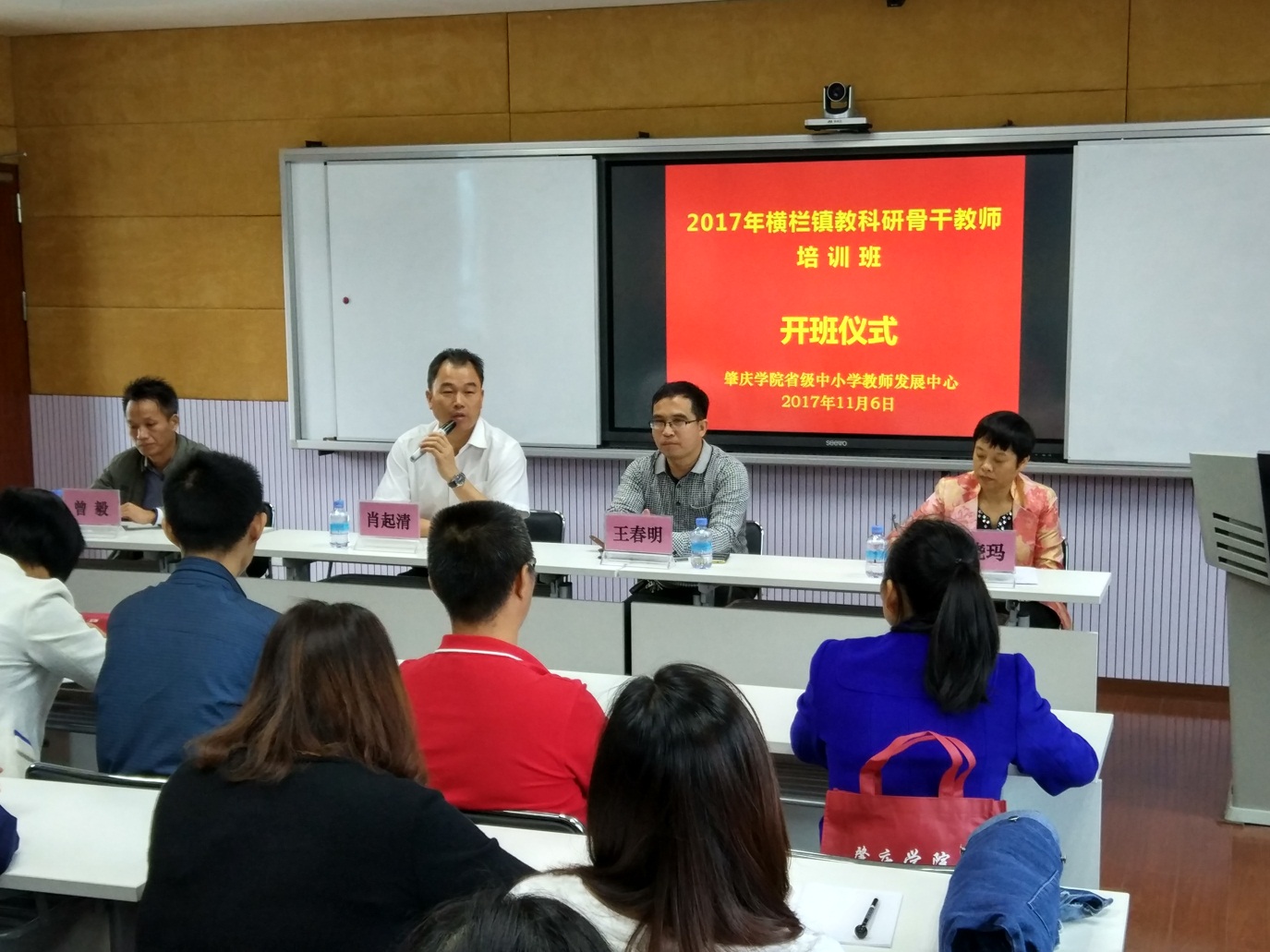 11月6日上午,2017年中山市横栏镇教科研骨干教师培训班在肇庆学院省级中小学教师发展中心401室隆重举行。肇庆学院williamhill威廉希尔官网院长、肇庆学院省级中小学教师发展中心主任肖起清教授、肇庆学院省级中小学教师发展中心副主任肖晓玛博士、肇庆学院williamhill威廉希尔官网副院长曾毅教授、中山市横栏镇教育事务指导中心教科研专干王春明,以及来自横栏镇中小学、幼儿园的50名学员共同出席开班仪式。