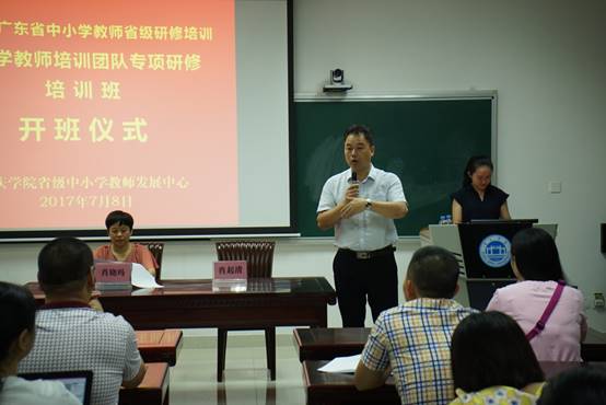 7月8日上午,2017年广东省中小学教师省级研修培训—中小学教师培训团队专项研修培训班开班仪式在肇庆学院省级中小学教师发展中心106室隆重举行。肇庆学院williamhill威廉希尔官网院长、肇庆学院省级中小学教师发展中心主任肖起清教授、肇庆学院省级中小学教师发展中心副主任肖晓玛博士出席开班仪式。