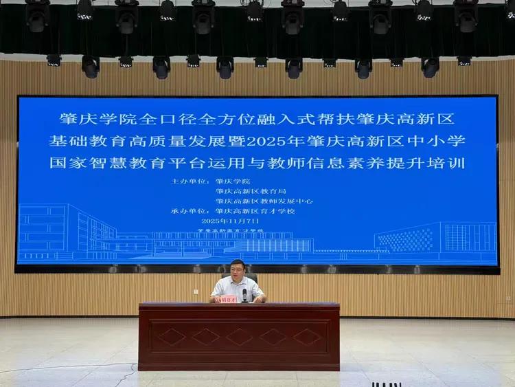 为深入推动基础教育高质量发展,助力教师掌握现代教育技术、提升信息素养,11月7日,肇庆学院全口径全方位融入式帮扶肇庆高新区基础教育高质量发展项目暨2025年肇庆高新区中小学国家智慧教育平台应用与教师信息素养提升培训在肇庆高新区育才学校成功举行。全区300余名中小学教师齐聚一堂,共同参与这场聚焦AI应用与智慧教育前沿的专题培训。