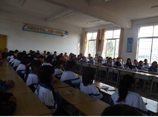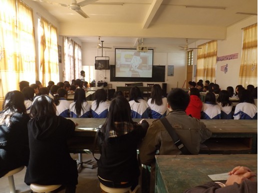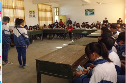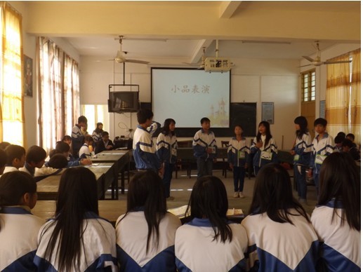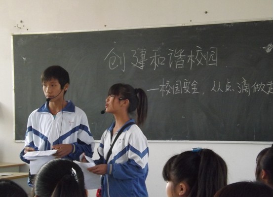 三位实习生黄秋菊、黄敏珊、沈建威参与今周的班会评比课。首先担任七年级副班主任的实习生黄秋菊于星期三开展“校园安全——从习惯做起”的班会评比课,届时有学校领导、驻地老师和其他实习生到场听讲。班会以一个学生扮演食物中毒晕倒的小品开始,当时现场观众真的以为是发生了突发事件,由于学生全心全意投入角色的表演,受到在场老师的一致赞扬。在接下来的环节中还有学生的精彩朗诵诗歌——《弟子规》、学生自由发言等丰富活动,环节层层紧扣,学生激情高昂,教师作总结时能及时升华主题,循序渐进。由于这次的主题班会对象是七年级的学生,黄秋菊老师能够以学生为中心结合身边的实例来发挥他们表演能力与组织能力。主题贴近生活,学生表演度及其丰富,此次班会课得到学校评委的一致好评。(图片下三张)