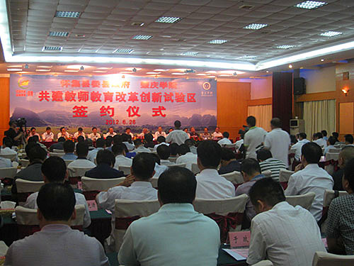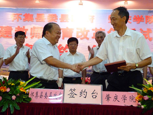 本网讯(宣传部 报道) 6 月26日,我校与中共怀集县委、县政府在怀集县签订合作协议。双方一致同意,以县校对接、校校对接的方式,在怀集县辖区内建成全省第一个教师教育改革创新试验区。 省教育厅副厅长李学明的代表、师资管理处副处长许曙,肇庆市委副书记吴华钦,市教育局直属机关党委副书记石抗,怀集县委书记江森源,校党委书记郑彬涛,校长和飞,校党委副书记叶峥嵘、胡宝坚,副校长周苏平、王忠等领导出席签约仪式。江森源、郑彬涛、石抗、许曙、吴华钦先后致辞,祝贺教师教育改革试验区成立,高度评价试验区在学校和地方人才培养、科学研究、社会服务等工作中所具有的探索性、改革性和开创性的重大意义,希望双方真诚携手,鼎力合作,互相支持,彼此促进,实现双赢,共同在推动教育事业发展的进程中有新的建树,为怀集和肇庆地方经济社会发展,构建和谐社会作出新的更大的贡献。和飞、江森源分别代表我校和怀集县委县政府签约。 签约仪式结束后,在怀集县有关领导的陪同下,校领导以及随行的各二级学院、职能部门负责人,一起参观了入选试验区基地学校的怀集二中和梁村中学。其中,怀集二中将建成我校第二附属中学。 师范学部牵头成立试验区 扎实推进教师教育改革 我校自建校以来,一直把师范教育作为立校之本,在专业设置、学科队伍、师资配备、课程体系、师能培养、教育实习等方面发挥优势,形成了优良的师范特色。根据《教育部关于大力推进教师教育课程改革的意见》和广东省教师工作会议精神,结合广东省基础教育尤其是农村教育实际和本校教师教育改革发展需要,我校在2011年大力整合校内师范教育资源,组建了统筹协调全校师范教育改革创新的师范学部。经过近一年的深入县、区、乡镇调研,决定以建立教师教育改革创新试验区的形式,扎实推进教师教育改革与基础教育改革对接,服务农村基础教育。 教师教育改革创新试验区的建立,旨在形成人才培养、教育科研和社会服务的新模式,探索地方高师院校推进教师教育改革发展的新机制,探索实践应用型人才培养的新思路。同时,试验区亦将为学校教育科研对接基础教育提供平台,为培养和锻炼教师教育师资队伍提供基地,为教师教育职前职后一体化以及当地中小学教师专业发展和继续教育等方面提供场所。 首个试验区选址怀集 帮扶山区基础教育提升质量水平 怀集县地处广东西北部,属于山区行政县。全县目前有各类中学30多所,小学300多所,中小学生20多万人。从总体上说,支撑当地教育的师资队伍从数量和质量上都与地方教育事业发展的需要存在一定差距。经与怀集县委县政府充分协商,我校将第一个教师教育改革创新试验区设置在怀集县,在该县辖区内15所以上符合条件的中小学设立试验基地。通过联手打造高校、地方政府、中小学三位一体的合作培养机制,在探索我校推进教师教育改革新机制、新模式,实现实习支教和师范生培养一体化、教师教育职前职后一体化、高校教育科研与基础教育教学改革对接的同时,更直接为提升怀集县基础教育的质量、水平提供有力帮助。因此,试验区的成立,不仅是新形势下教师教育改革的新探索,更是地方高校服务地方经济社会发展的新作为,是扶持山区基础教育的实招。 多管齐下,通过顶岗实习、置换培训、专家驻校、教育科研等方式,开展教师教育改革实践 每年,我校将根据各基地学校师资的需求,安排高年级优秀师范生到这些学校顶岗实习。通过具有“集中、成片、持续”等特点的顶岗,置换长年在乡村中小学执教的教师,使他们能够腾出身来参加各类培训及接受教师学历教育,为这些学校教师的业务提高提供帮助,为这些学校制定和实施教育事业发展规划和教师队伍建设规划提供专家咨询和师资支持。 双方协议还包括我校选派教授、专家到试验基地学校兼任中小学分管科研副校长,安排相应学科、专业的高职称教师和研究人员定期到试验区中小学开展学术专题讲座,指导中小学教师开展基础教育课程改革和教学研究等内容。双方希望通过试验区项目的实施,切实逐步解决城乡教育的均衡问题,乡村特别是山区中小学师资短缺,学历偏低,进修提高难的问题,提高所在区域中小学校师资队伍建设水平、专业发展水平和教育教学质量。 双方协议对实习生实行“双导师制”,共同担负师范生培养,即由我校安排驻地指导教师,怀集县选派有经验的骨干教师共同指导实习学生,还将在当地开拓优质资源,为实习学生安排教师教育专业尤其是教师职业技能的学习与培训。学生边学习边实践,在实践中学习,在学习中得到实践能力的培养。 |