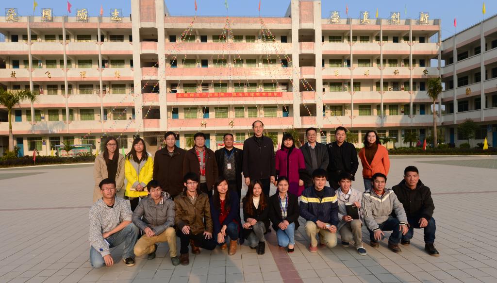 校领导一行和怀集教育局副局长、梁村中学校长以及实习生合影留念