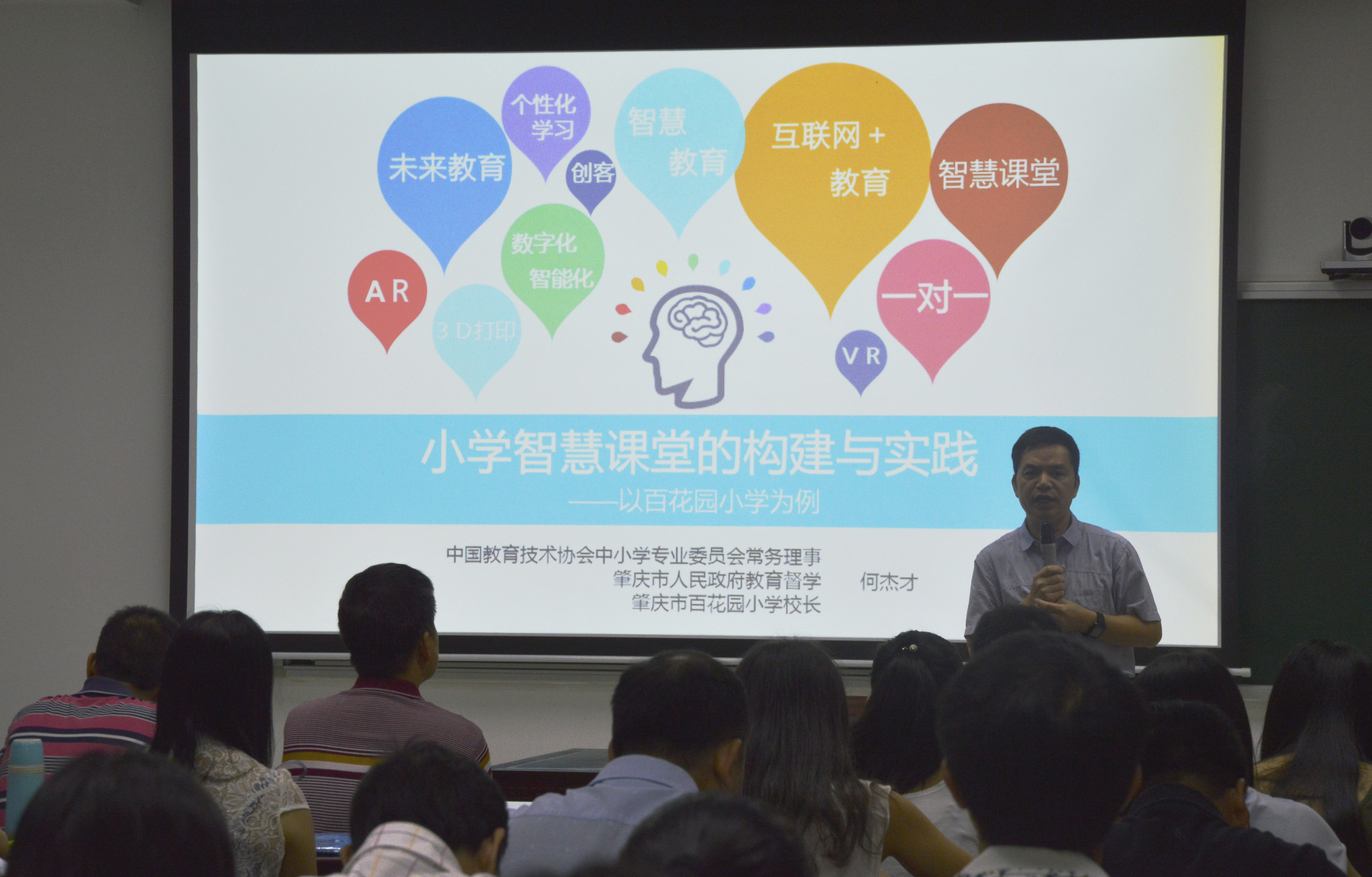 23日上午,教师发展中心邀请了肇庆市人民政府教育督学、百花园小学校长何杰才应邀为学员们授课。他以百花园小学为例,从四个方面介绍了小学智慧课堂的构建与实践运作。