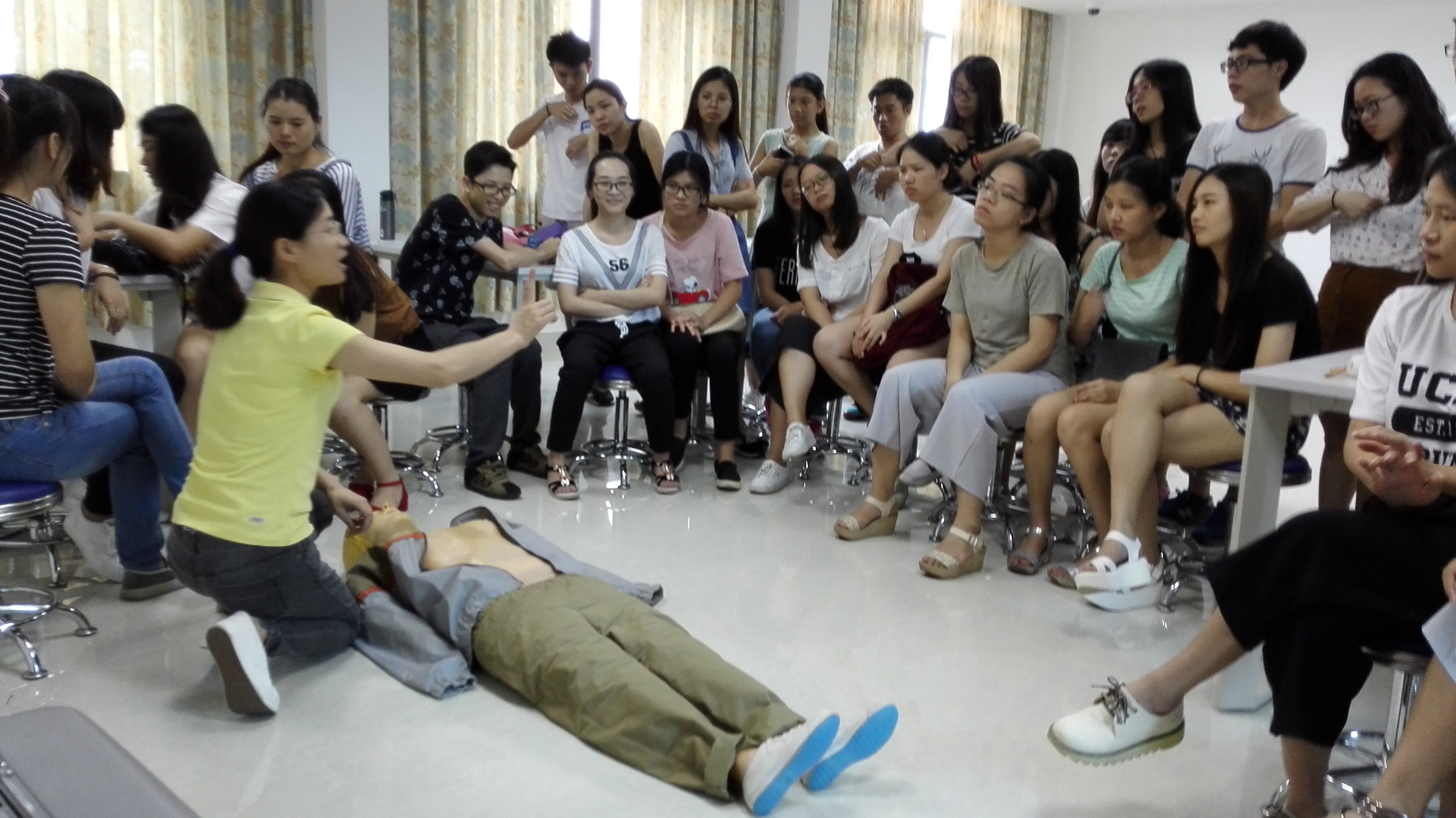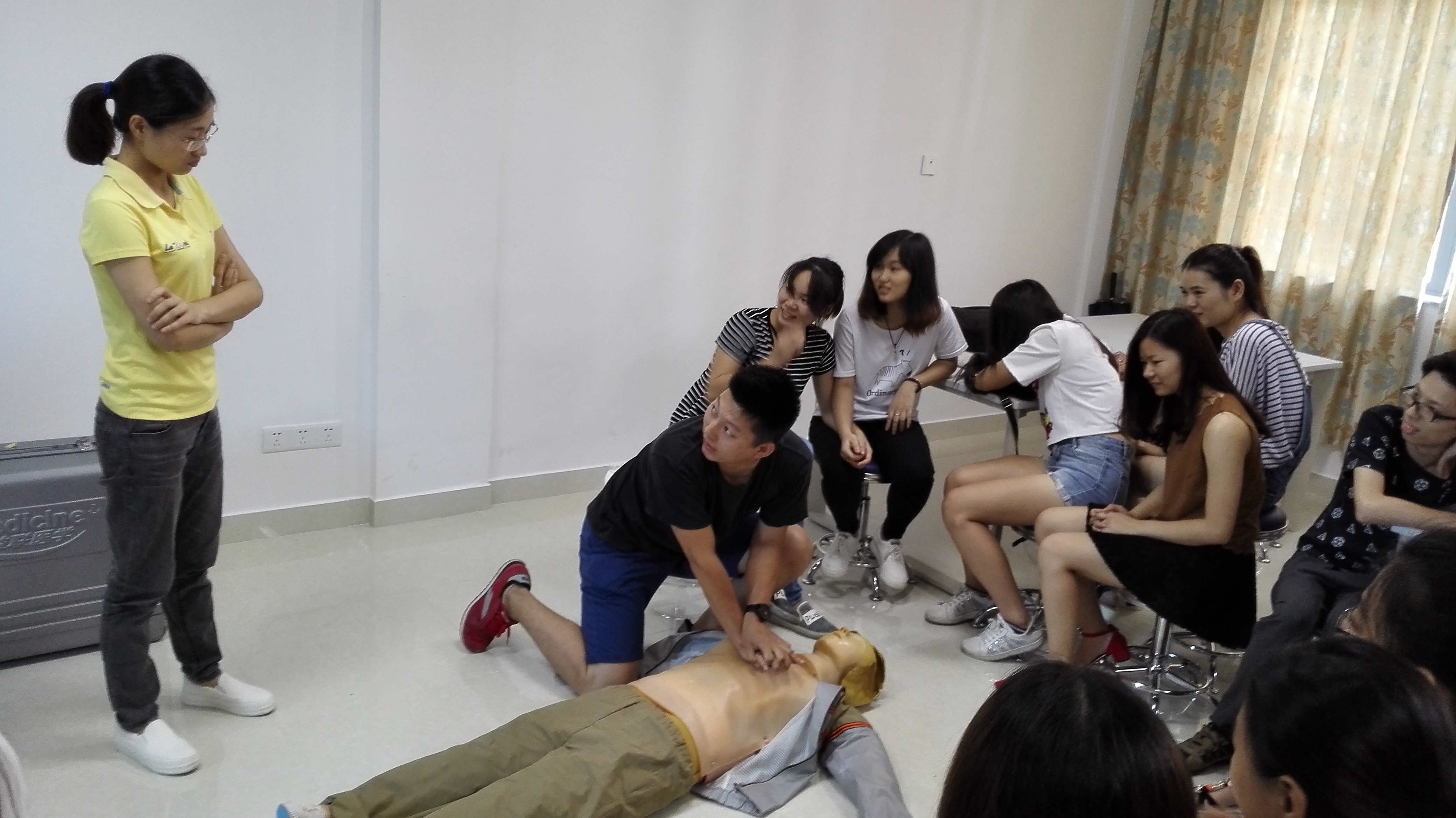 本次岗前培训根据常规教学安排,邀请了肇庆中学教学名师、怀集县特级教师从中学教学与管理、课堂教学的沟通技巧等方面展开讲解与培训。此外,根据当地农村中小学留守儿童自我保护意识和自救能力较弱的特点,特增设了安全与急救方面的课程,通过理论讲解、动手实践等形式进行教学和操作,使每一位支教实习生都懂急救方法、都能动手操作,总课时数达到11学时。