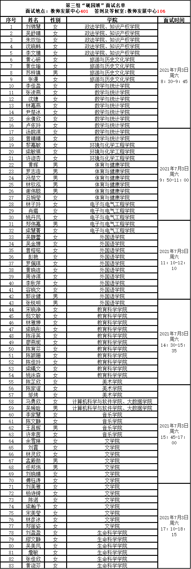 2021年7月3日,请根据分组情况查看签到地点(面试分为三组),请至少提前一个小时完成签到,并在此候场等待