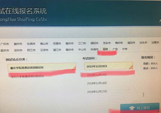 报名步骤:1.登陆系统后点击[我要报名];2.选择高校;3.选择肇庆学院普通话培训测试站;4.选择考试时间;5.点[网上报名]