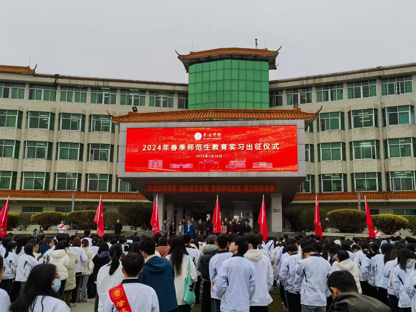 2月28日上午, 2024年春季师范生教育实习出征仪式在国砚广场隆重举行。校长吴业春、副校长肖起清出席,相关职能单位负责人和相关二级学院院长、书记、分管实习工作的副院长、实习基地校长代表、实习指导教师和全体顶岗支教实习生约2000余人参加。