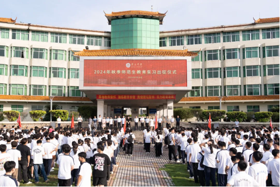 9月3日,2024年秋季师范生教育实习出征仪式在国砚广场举行。校党委书记谢冠华出席,副校长肖起清主持,相关职能单位负责人和各二级学院院长、分管实习工作的副院长、教育实习指导教师和学生代表参加。
