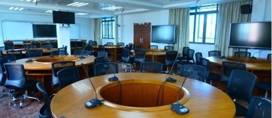 课室配置:面积120平方米,可容纳56人,配置高配计算机1台、触控一体机6台、6路高清录播系统、音响系统1套。