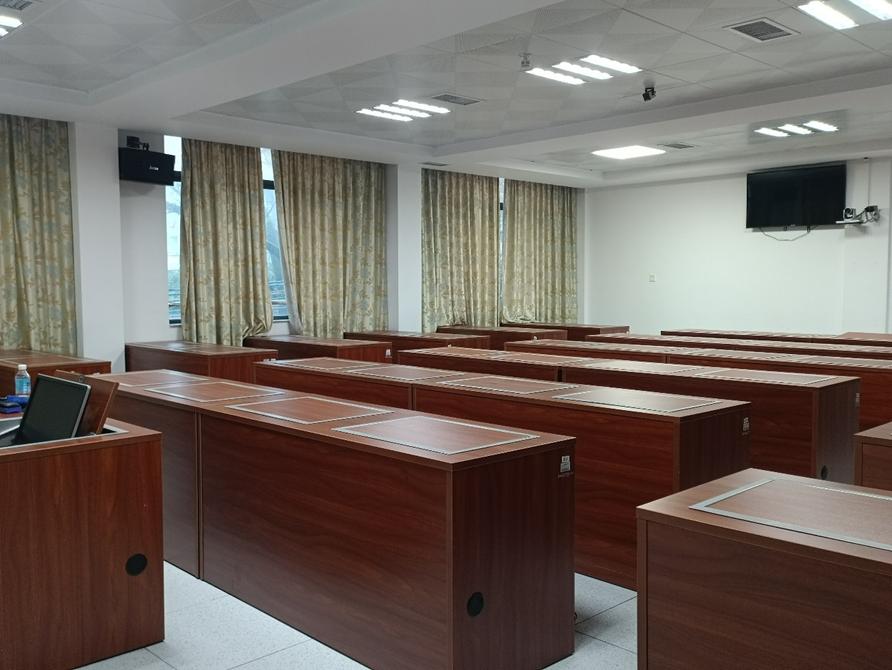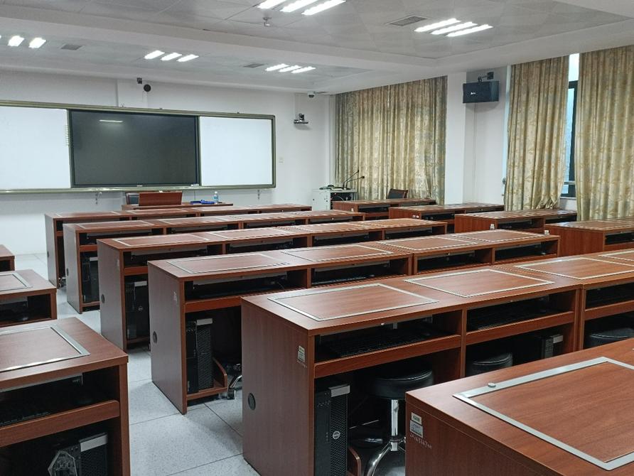 课室配置:面积78平方米,可容纳45人,配有教师电脑1台、学生电脑45台、电子交互白板,4机位录播系统,有固定式白板。