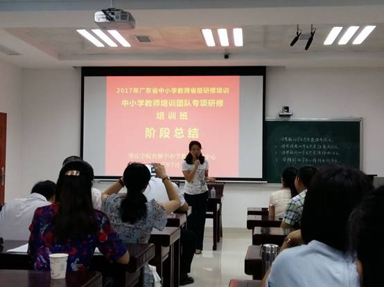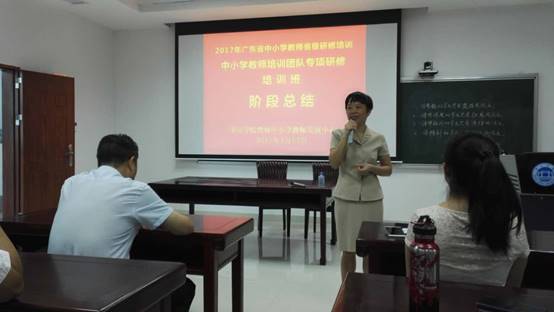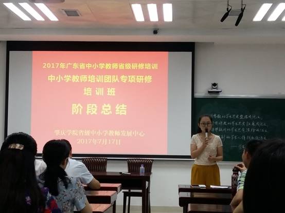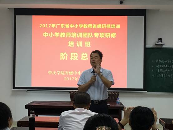 2017年7月17日上午,广东省中小学教师培训团队专项研修培训班(肇庆学院)在肇庆学院省级中小学教师发展中心106室举行阶段总结会。肇庆学院williamhill威廉希尔官网院长、肇庆学院省级中小学教师发展中心主任肖起清教授、肇庆学院教师专业能力发展中心副主任、教师教学发展中心副主任肖晓玛博士、班主任洪清老师等出席总结会。来自全省21个地市共48名小学语文教研员和骨干教师齐聚一堂,分享培训以来的心得与总结。