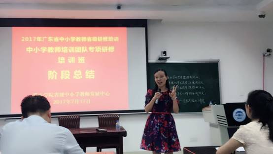 首先,小组代表分别进行总结报告。本次培训班共分为7个小组,各组学员代表分别上台发言。来自广州市海珠区海联路小学的刘伟栋老师作为第一组学员代表上台发言,他以“世间所有的相遇都是久别重逢”为开场,围绕“感恩”、“遇见”这两个关键词展开,与学员们分享了十天课程中的点滴收获和刻骨铭心的时刻;来自广州市从化区教育局教研室的马水莲老师作为第二组学员代表发表心得,马老师用“一培到底、一训有效”来总结本次培训的收获,引发了学员们的广泛共鸣;来自汕头市澄海实验小学的许巧玫老师作为第三组学员代表发表心得,许老师的发言铿锵有力且闪动着智慧,精彩的发言博得阵阵掌声;另外,还有来自高州市教育局研究式的林彩红老师、肇庆高新区龙湖小学的欧志安老师、茂名市茂南区教育局的黄珍宇老师、中山市三乡镇文体教育局的王建国老师等作为各组代表上台发言,大家发自肺腑的感言,或提纲掣领、或深度总结,或诙谐幽默、或感人至深,现场一度沉浸在学员们积极昂扬而又依依不舍的氛围中。