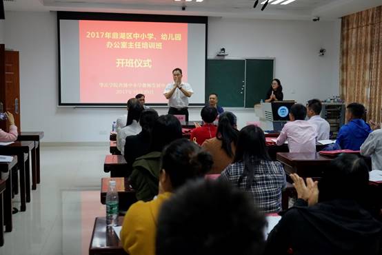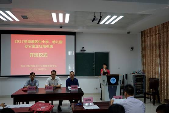10月29日上午,2017年鼎湖区中小学、幼儿园办公室主任培训班在肇庆学院省级中小学教师发展中心106室隆重举行。肇庆学院williamhill威廉希尔官网院长、肇庆学院省级中小学教师发展中心主任肖起清教授、肇庆学院省级中小学教师发展中心副主任肖晓玛博士、肇庆学院williamhill威廉希尔官网副院长曾毅教授、鼎湖区教育局工会主席刘戊宜、鼎湖区教育局教研室副主任谭可平,以及来自鼎湖区中小学、幼儿园的32名学员共同出席开班仪式。