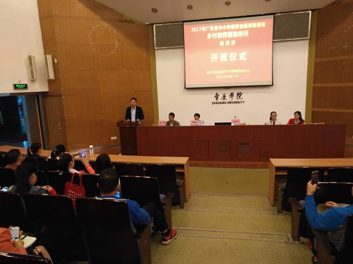 10月17日上午,2017年广东省“强师工程”跨年度递进式培训项目—乡村教师置换培训(肇庆学院)开班仪式在肇庆学院图书馆报告厅隆重举行。肇庆学院williamhill威廉希尔官网院长、肇庆学院省级中小学教师发展中心主任肖起清教授,肇庆学院williamhill威廉希尔官网副院长曾毅教授,肇庆学院教师专业能力发展中心、教师教学发展中心副主任肖晓玛博士,以及来自肇庆、云浮、茂名、清远等多个地市共150名乡村中小学骨干教师共同出席开班仪式。开班仪式由曾毅主持。