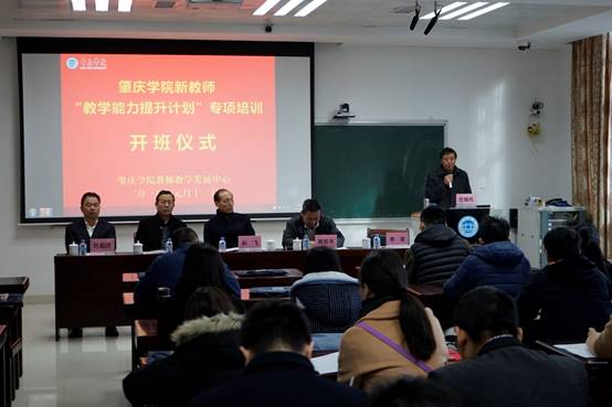 首先,教师教学发展中心肖起清主任发表讲话。肖起清主任首先介绍了教师教学发展中心的职能和定位,即致力于肇庆学院教师教学理念的更新、教学水平和教学能力的提升和促进我校教师教学质量的不断提高。同时,他还阐述了举办本次新教师培训的目的和重要意义,并列举实例指出当前大学教师在教学设计、语言表达、板书表达、教育技术等教学基本素养方面存在的一些问题,希望在座的新进青年教师能够充分利用好业余时间,主动投入培训学习,切实提高自身的教育教学能力。