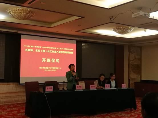 2018年11月10日上午,广东省中小学幼儿园骨干教师、校(园)长省级培训研修项目:名教师、名校(园)长工作室入室学员集中研修项目(名校长及高中学段教师)在肇庆金鹏巴顿酒店隆重举行。肇庆学院教学发展中心、肇庆学院教师专业能力发展中心副主任肖晓玛,肇庆学院williamhill威廉希尔官网教师洪清、王贤文、张琼、王子瑫,以及来自中山、江门、阳江、肇庆及云浮地区的名校长工作室入室学员、高中学段的名教师工作室入室学员共计225人,共同出席了开班仪式。