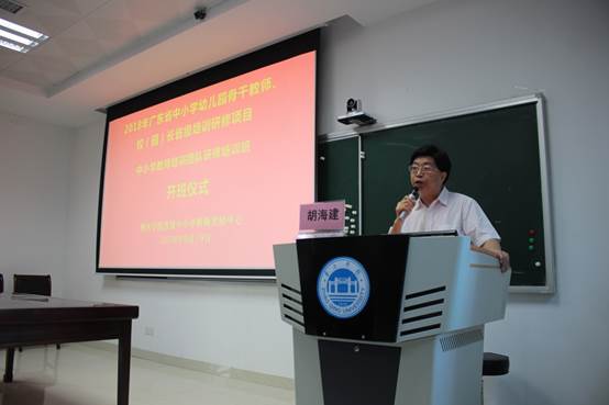 接着,导师代表胡海建教授发言。胡教授围绕此次培训的重要意义、广东基础教育的现状、名师工作室主持人肩负的重任等角度进行了深入的分析,殷切希望在座的学员们不断修炼,为广东基础教育做出更好更多的贡献。