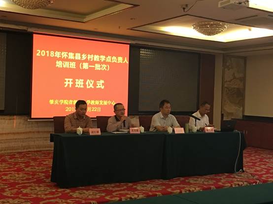2018年10月22日下午,2018年怀集县乡村教学点负责人培训班(第一批次)隆重开班。肇庆学院williamhill威廉希尔官网院长肖起清教授,怀集县教育科研中心副主任莫美雄,怀集县教育中心培训处主任黎培坚,县教育局人事股教师谢红敏。以及来自怀集县的80名乡村教学点负责人共同出席了开班仪式。