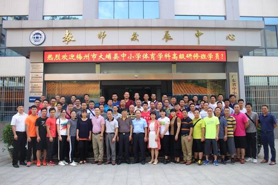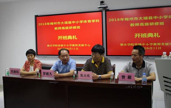 2018年6月11日上午,梅州市大埔县中小学体育学科教师高级研修班在肇庆学院省级中小学教师发展中心101课室隆重开班。肇庆学院williamhill威廉希尔官网党总支书记张占亮教授、肇庆学院williamhill威廉希尔官网副院长曾毅教授、肇庆学院教师专业能力发展中心副主任肖晓玛博士、梅州市大埔县教育局基础教育股体卫负责人罗超凡同志等出席开班仪式。