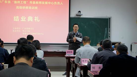 最后,廖荣辉主任发表重要讲话。廖主任高度肯定了此次培训的成效:课程安排合理,师资力量雄厚,学员学习认真。廖主任对市县教师发展中心建设工作做了重要部署,着重强调以下几点:1、逐步推进、因地制宜,机构整合不强求统一模式,在建设过程中多进行专题论证,积极推动建设工作。2、理清思路、完善方案、优化资源整合。3、敢于担当,在省厅推动下,学会助推自身,且借力其他机构与部门的资源,争取2019年8月,顺利通过绩效考核。4、加强质量监控,在培训项目开展过程中,切记不要选择“无证件、无场地、无食宿的三无机构”作为培训项目实施机构。5、努力做到几个新目标:健全培训体系;培育省市县三级体系的名师、名校长工作室主持人、展开五年360学时精准培训、培育专业发展学校;拟定分科分类课程指南;展开培训“新管理”、建设信息化管理平台;设置培训指南与项目指南;引入第三方,对所有培训项目进行现场抽查,展开“新评估”。