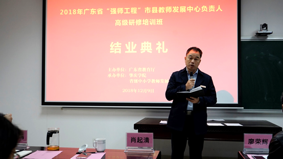12月9日上午,2018年广东省“强师工程”市县教师发展中心负责人高级研修班汇报研讨会暨结业典礼在肇庆学院省级中小学教师发展中心106隆重举行。广东省教育厅继续教育指导中心廖荣辉主任、广东省教育厅马桂波科长、肇庆学院williamhill威廉希尔官网肖起清院长、肇庆学院教师教学发展中心肖晓玛副主任等,以及51位学员,共同参加了汇报研讨会暨结业典礼。汇报研讨会暨结业典礼由肖晓玛主持。