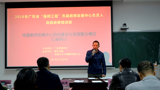 首先,进行了汇报研讨会。针对市县教师发展中心目前建设与资源整合情况,广州市白云区教育发展中心副主任梁慧勤、汕尾市教育局人事科练世尊、湛江经济技术开发区教育局吴连助、茂名市茂南区教师进修学校校长李金龙等几位学员代表,围绕市县发展中心建设进展、成就、问题、困惑等进行了详细汇报,领导们现场指导,其他学员踊跃发言补充。