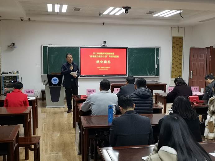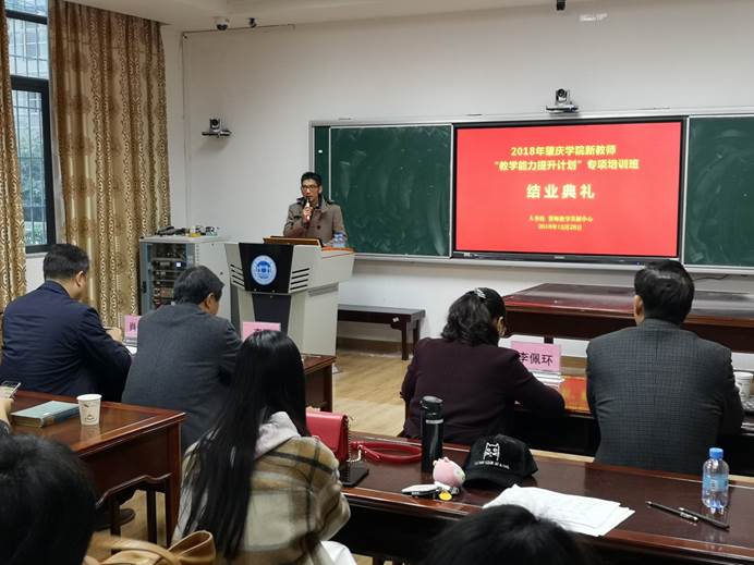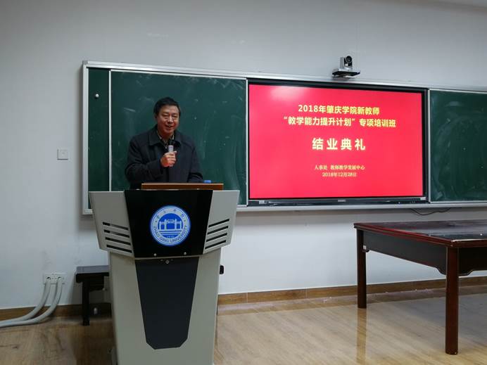 在肇庆学院领导的高度重视下,在人事处、教师教学发展中心的共同组织下,为期一年的肇庆学院新教师“教学能力提升计划”培训班圆满落下帷幕。本次培训结业典礼于12月28日在教师发展中心107室隆重举行。肇庆学院人事处处长李军、教务处处长丁孝智、评估中心主任李佩环、williamhill威廉希尔官网院长肖起清、教师教学发展中心副主任肖晓玛出席结业典礼。典礼由肖晓玛主持。