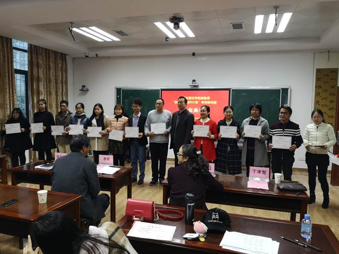 随后,领导们为在2018年肇庆学院新进青年教师教学技能比赛中获奖的老师们颁发荣誉证书。比赛分为说课、微课、粉笔字三个项目,各评出一二三等奖。